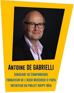 Antoine de Gabrielli, chef d’entreprise, marié, 6 enfants, et très investi pour une meilleure implication des hommes dans les politiques de mixité. Il est dirigeant de Companieros, fondateur de l'association "Mercredi-c-papa" et initiateur du projet Happy Men (qui réunit les hommes cadres dirigeants à la recherche d’un équilibre entre leur vie privée et leur vie professionnelle).