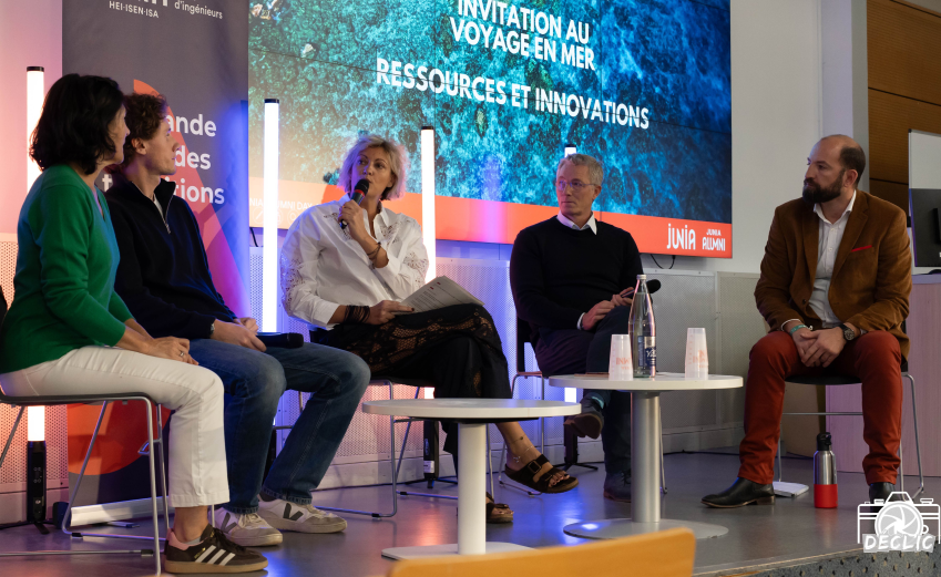Place ensuite à la table-ronde, animée par Anne Beaumeister et qui a accueilli pas moins de quatre intervenants aux profils variés. Avec, en témoin principal, Sophie Jourdain Vercelletto, ancienne directrice du Vendée Globe et co-fondatrice de Kaïros Environnement et du fonds Explore qui cherchent à apporter des solutions concrètes aux défis environnementaux actuels. Autour de la table-ronde se tenaient également deux intervenants de l’Ifremer, Xavier Harlay, Directeur du Centre Manche Mer du Nord et Pierre Cresson, Chercheur en écologie et biodiversité marines. Enfin, un diplômé JUNIA ISA 2019, Arthur Caulliez, fondateur du collectif Les Argonautes, qui communique sur les actions de protection des océans, complétait cette belle table-ronde.